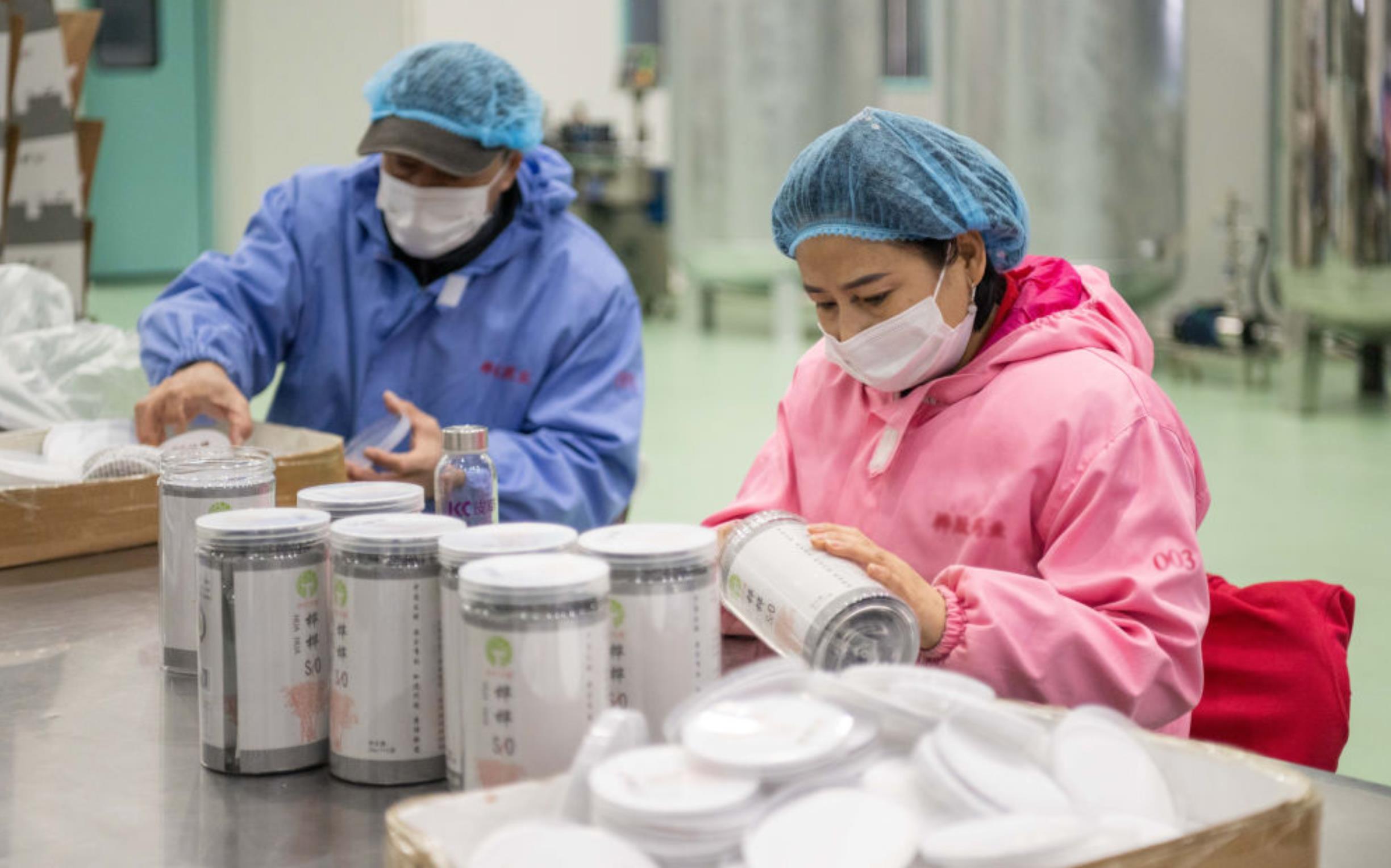 △2024年3月12日,黑龙江伊春一家公司内,工作人员在包装桦树汁相关产品。