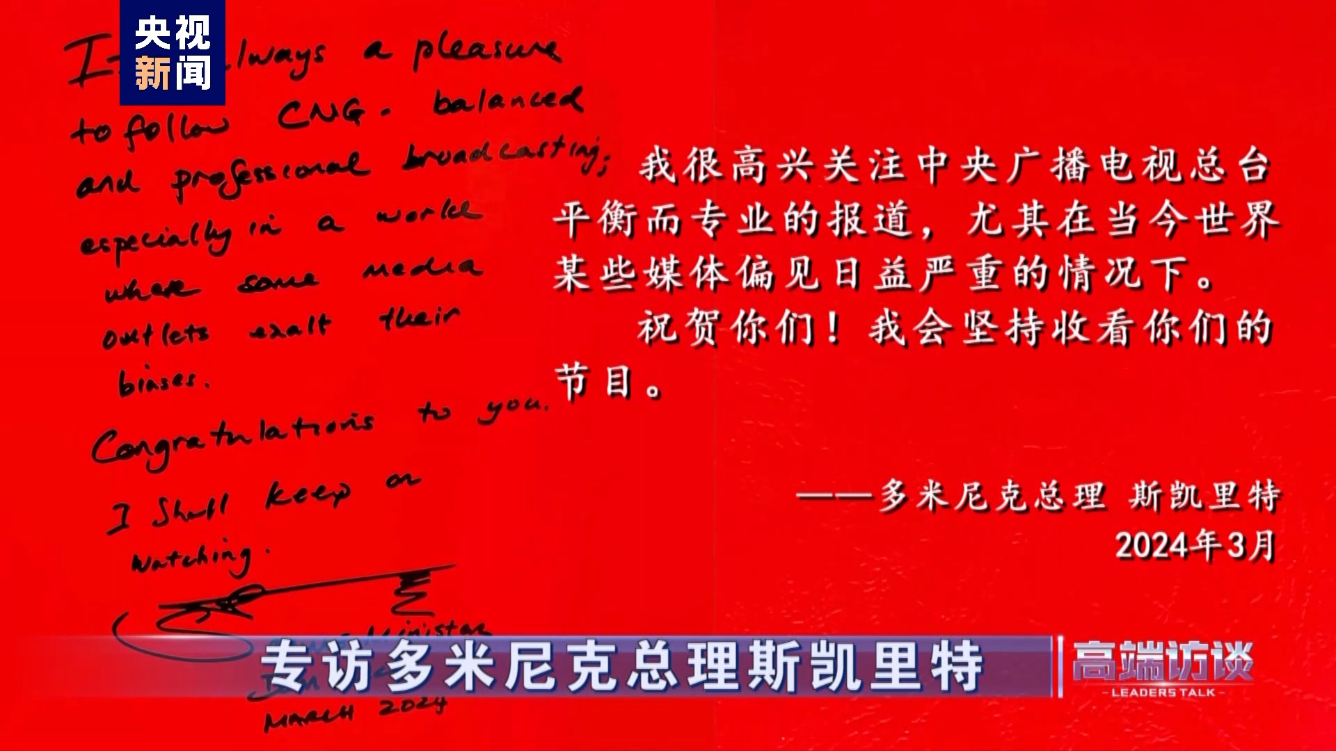 △多米尼克总理罗斯福·斯凯里特在接受总台专访后题词