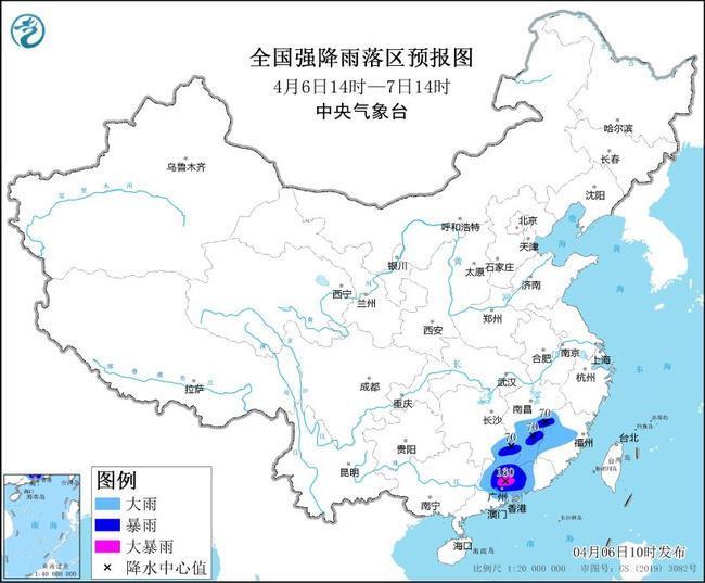 中央气象台4月6日10时继续发布暴雨黄色预警:预计4月6日14时至7日14时,湖南东南部、江西中南部、福建中西部、广东中部和西北部等地的部分地区有大到暴雨,其中,广东中部和西北部局地有大暴雨(100~160毫米)。
