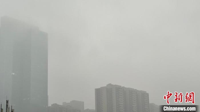 6日,广州暴雨,图为暴雨中模糊的高楼。王坚 摄