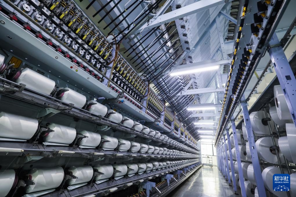 4月8日,在位于绍兴柯桥的绍兴诚邦高新纤维科技有限公司智能生产车间内,自动化设备在生产涤纶丝。新华社记者 徐昱 摄