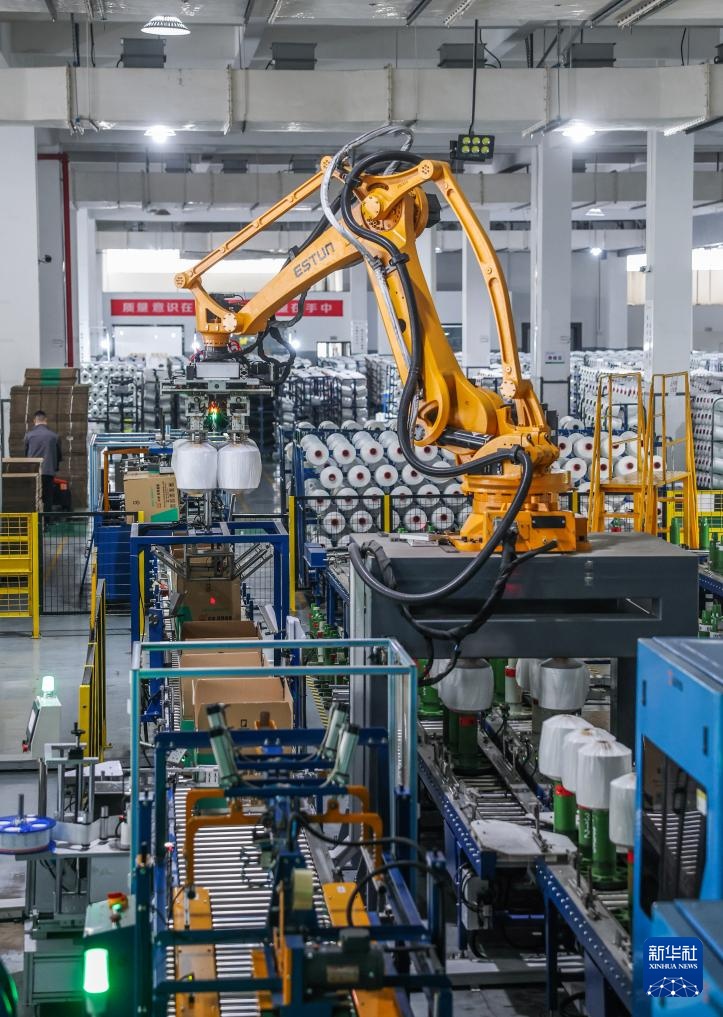 4月8日,在位于绍兴柯桥的绍兴诚邦高新纤维科技有限公司智能包装车间内,自动化机械臂正在打包、搬运产品。新华社记者 徐昱 摄