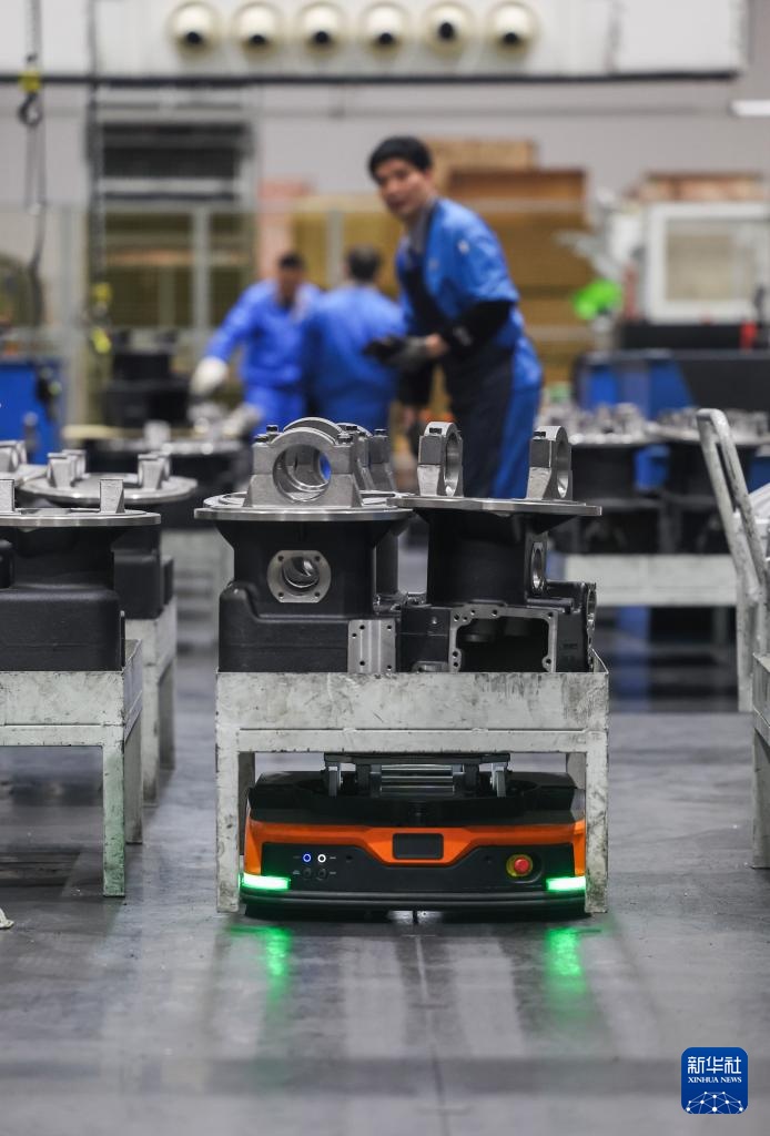 4月8日,在绍兴柯桥的浙江金道科技股份有限公司智能化车间内,AGV智能搬运机器人在车间里搬运零配件。新华社记者 徐昱 摄