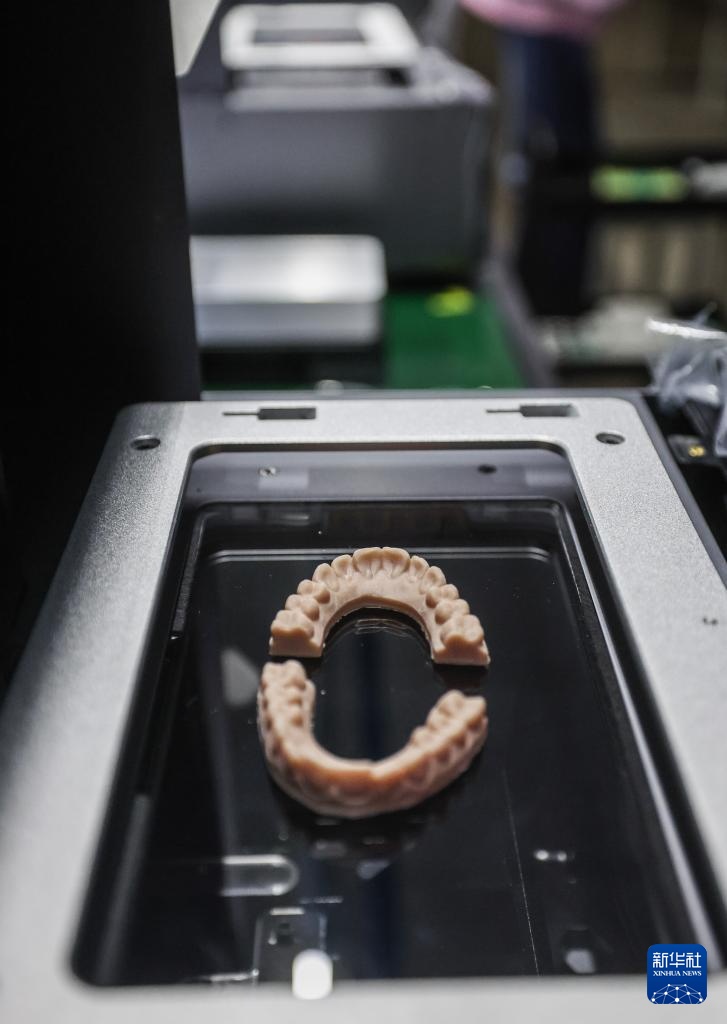 4月8日在绍兴柯桥的浙江迅实科技有限公司检测室拍摄的3D打印机打印出的牙齿模型。新华社记者 徐昱 摄