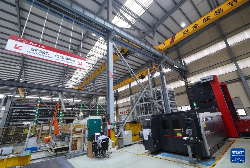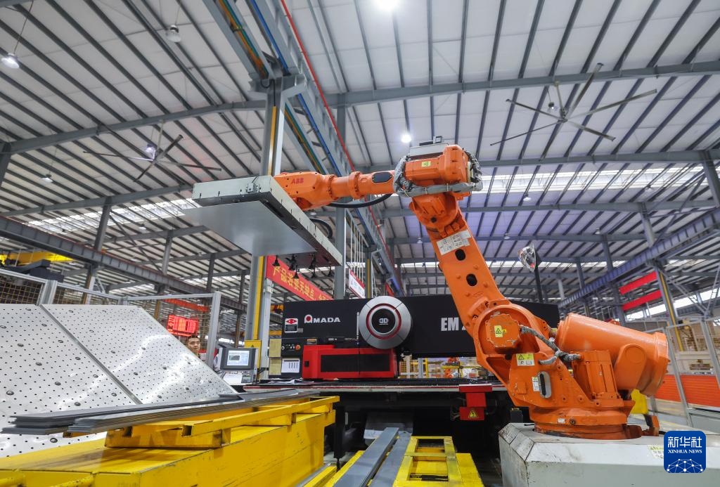 4月8日,在绍兴柯桥的浙江梅轮电梯股份有限公司智能化车间内,自动化设备在生产电梯配件。新华社记者 徐昱 摄