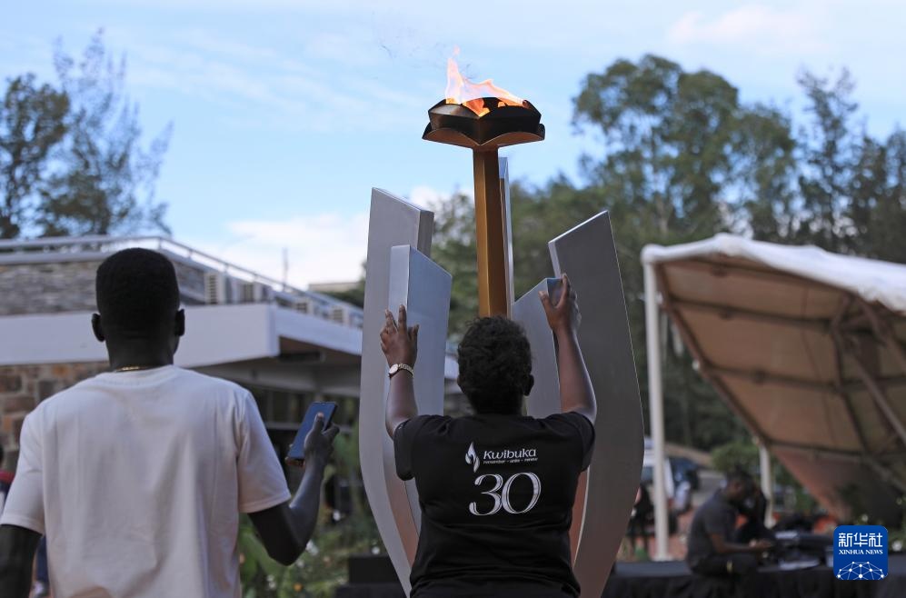 4月8日,在卢旺达首都基加利,参观者伫立在基加利大屠杀纪念馆纪念火炬旁。