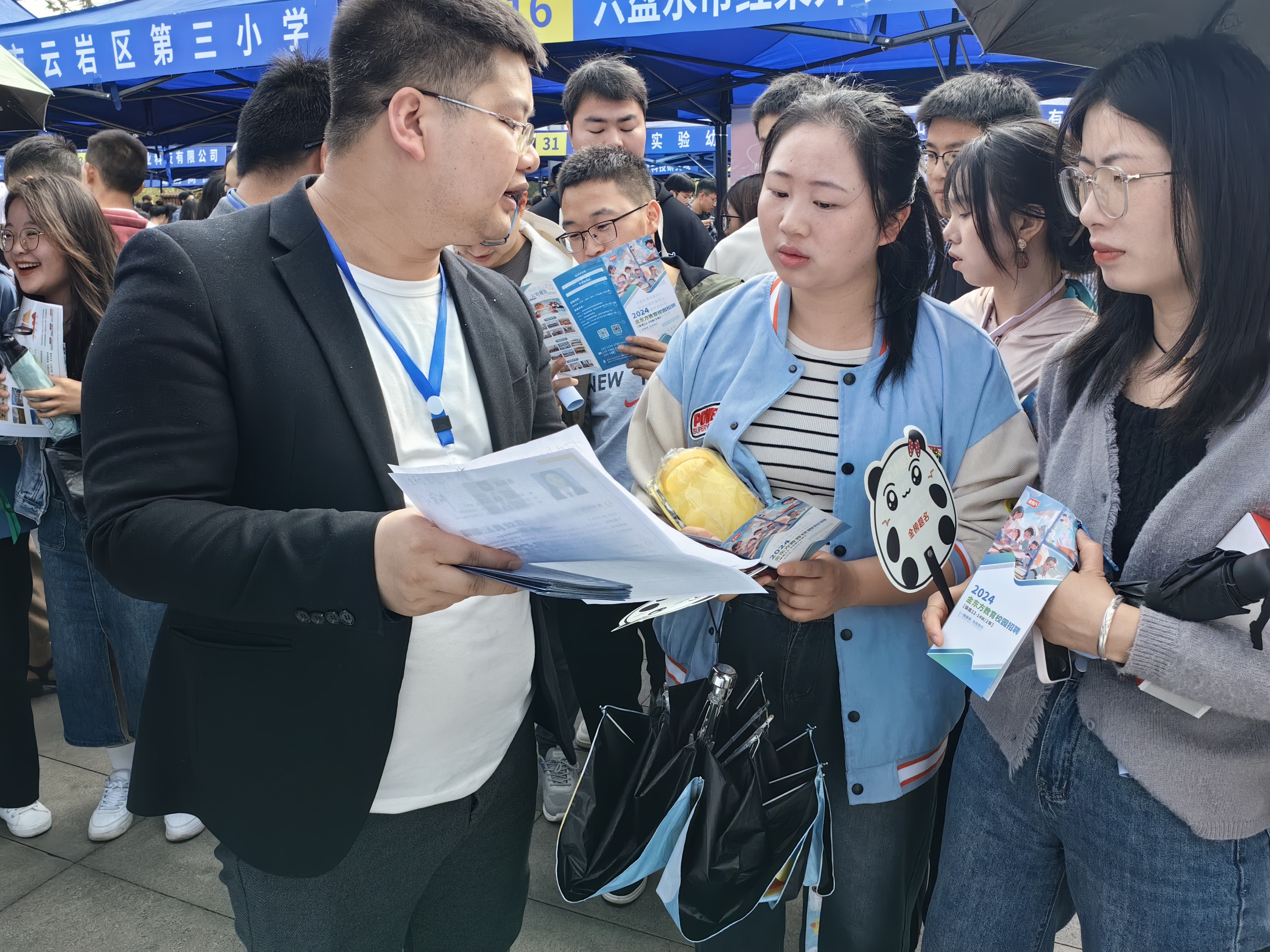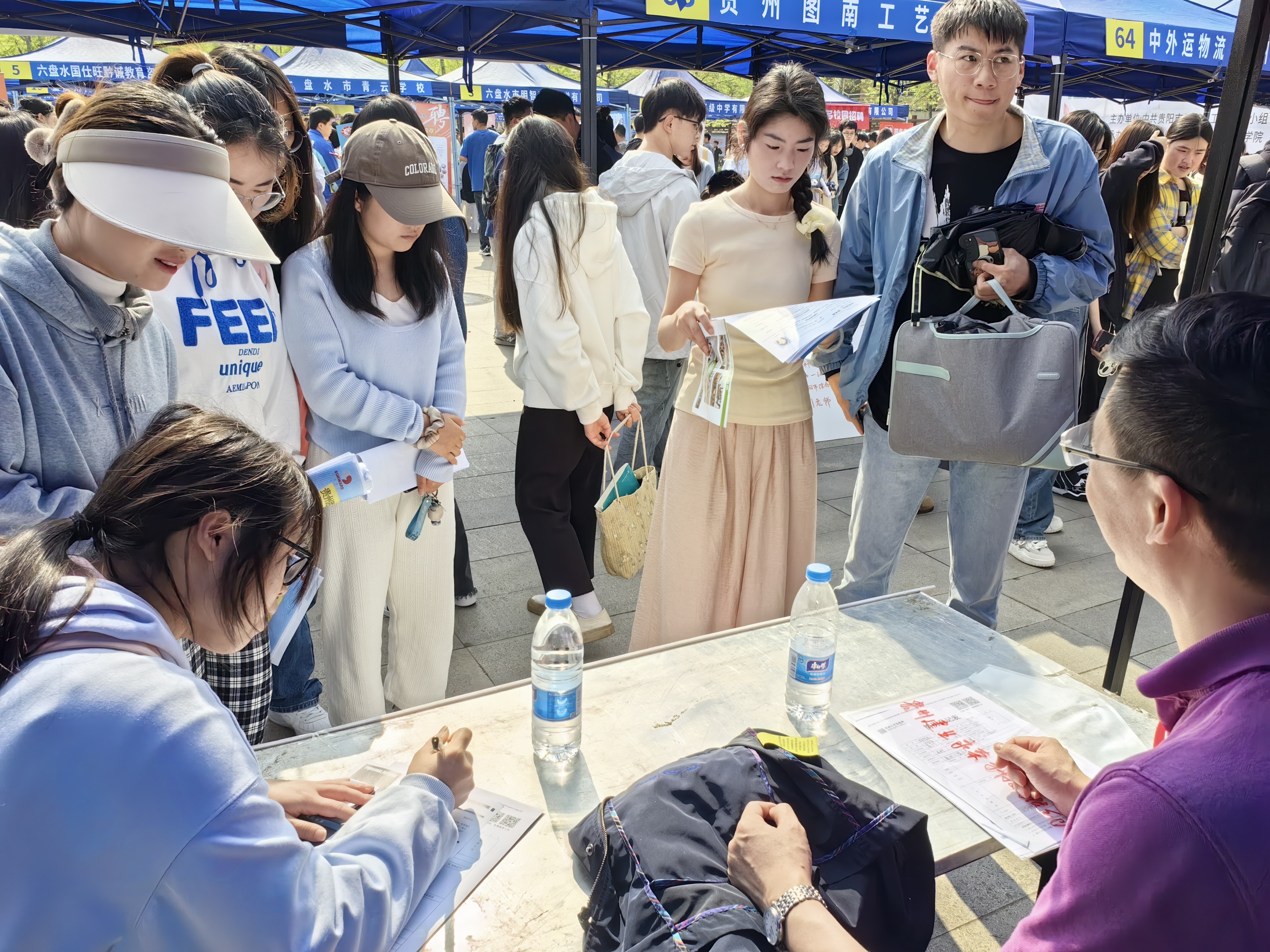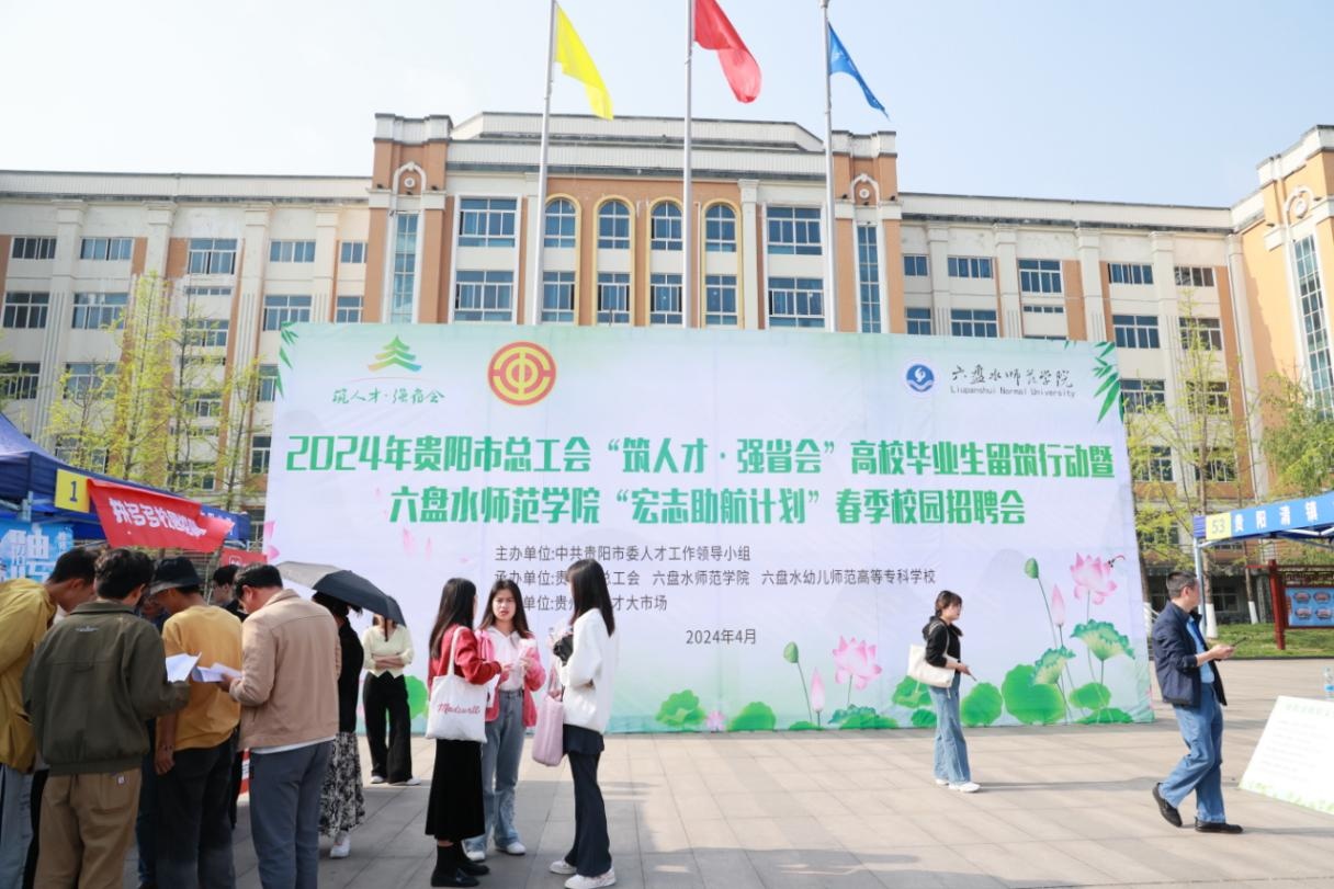 4月12日,六盘水师范学院校园内,一幅幅温情的宣传标语催人奋进,上午9时许,学校知行广场内已人头攒动,用人单位的招聘台前挤满了人,或了解信息,或投递简历、或现场面试……忙得不亦乐乎。是日,由贵阳市委人才工作领导小组主办,贵阳市总工会、六盘水师范学院等单位承办的2024年“筑人才·强省会”高校毕业生留筑行动暨六盘水师范学院“宏志助航计划”春季校园招聘会在这里举行。贵阳市人大常委会副主任、市总工会主席田胜松和六盘水师范学院有关领导出席并巡看现场招聘会。