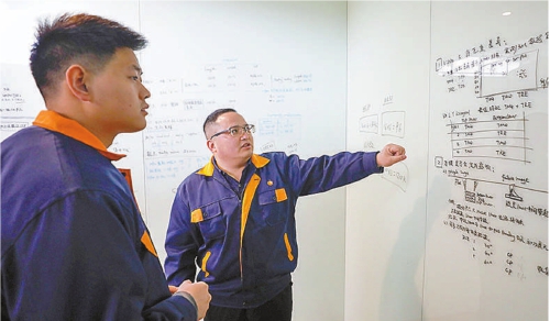 邵永海(右)与同事共同商讨改进技术参数路径。