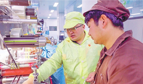 邵永海(左)在生产车间查看设备运行情况。