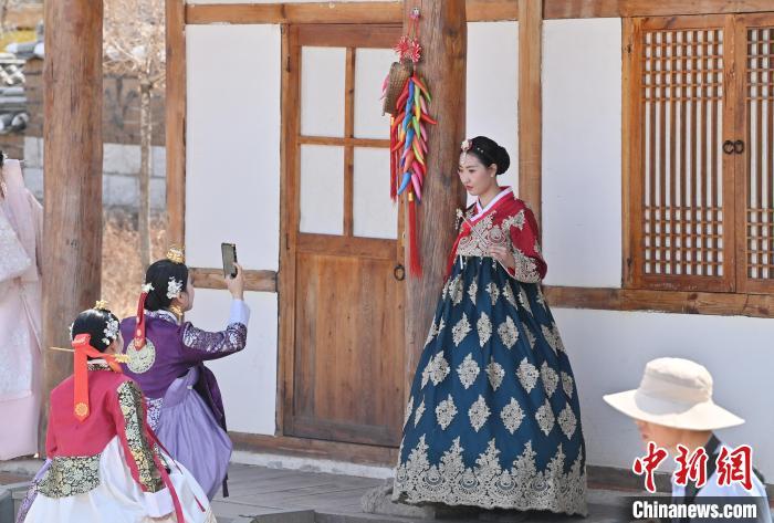 4月7日,在吉林省延吉市的中国朝鲜族民俗园内,游客身着朝鲜族服饰拍照。 中新社记者 张瑶 摄