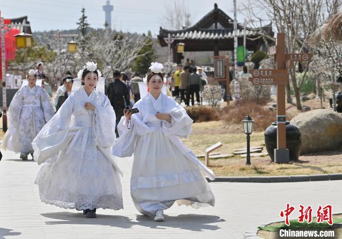 4月7日,在吉林省延吉市的中国朝鲜族民俗园内,游客身着朝鲜族服饰游玩。 中新社记者 张瑶 摄