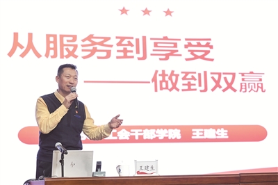 当全国五一劳动奖章获得者、北京市劳动模范、北京市总工会职工匠师王建生站上讲台时,此次开学典礼也进入了高潮阶段。他以“从服务到享受——做到双赢”为主题,为新生们上了“开学第一课”。课上,王建生用质朴的语言、详实的事例和真挚的感情,从乐于进取、勇于创新和甘于奉献肯于担当三个方面,讲述了他的成长历程与收获,并就如何大力弘扬劳模精神、劳动精神和工匠精神表达了自己的思考与见解。
