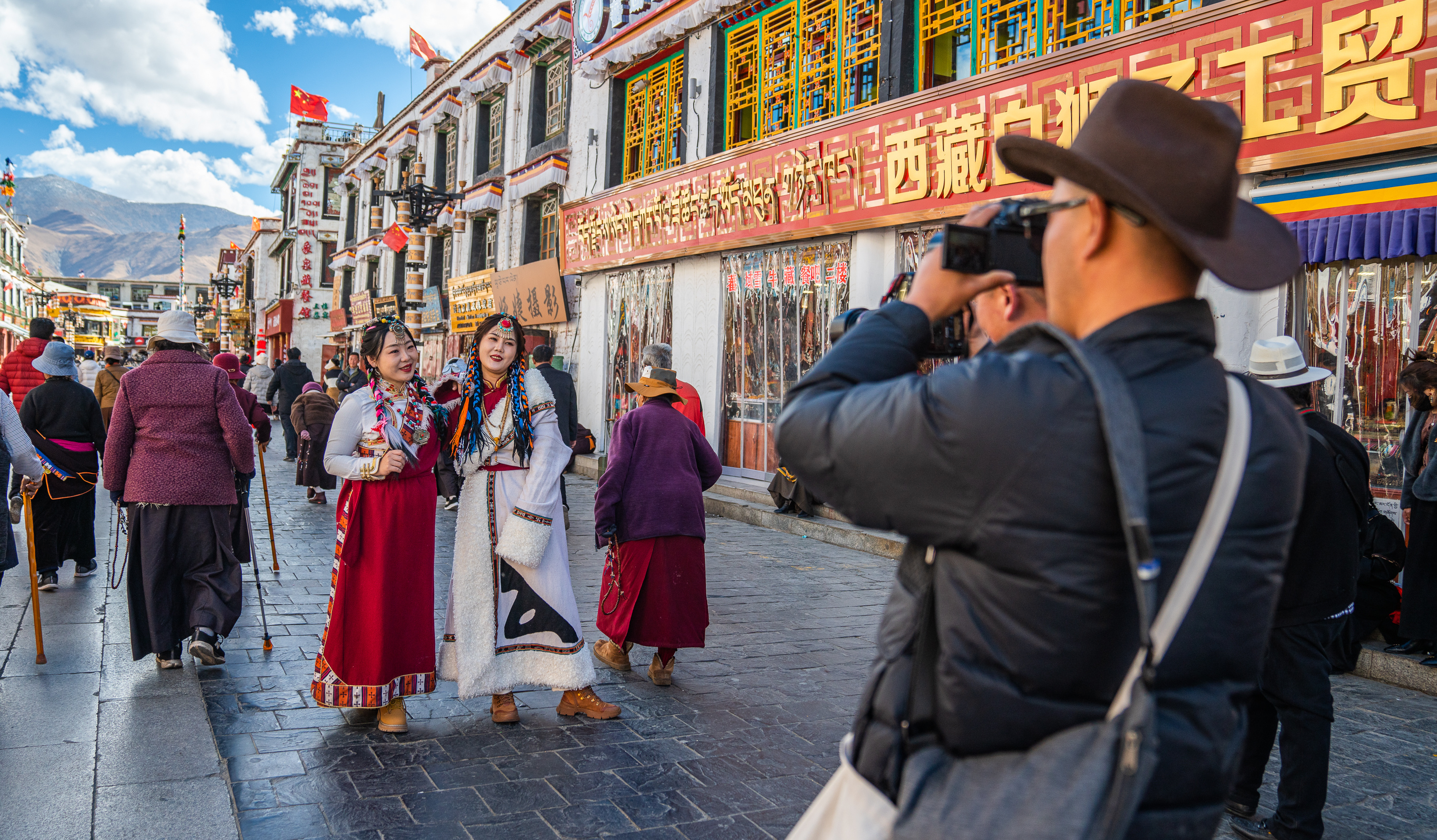 游客在八廓街街道上拍照留念。新华社记者 丁增尼达 摄