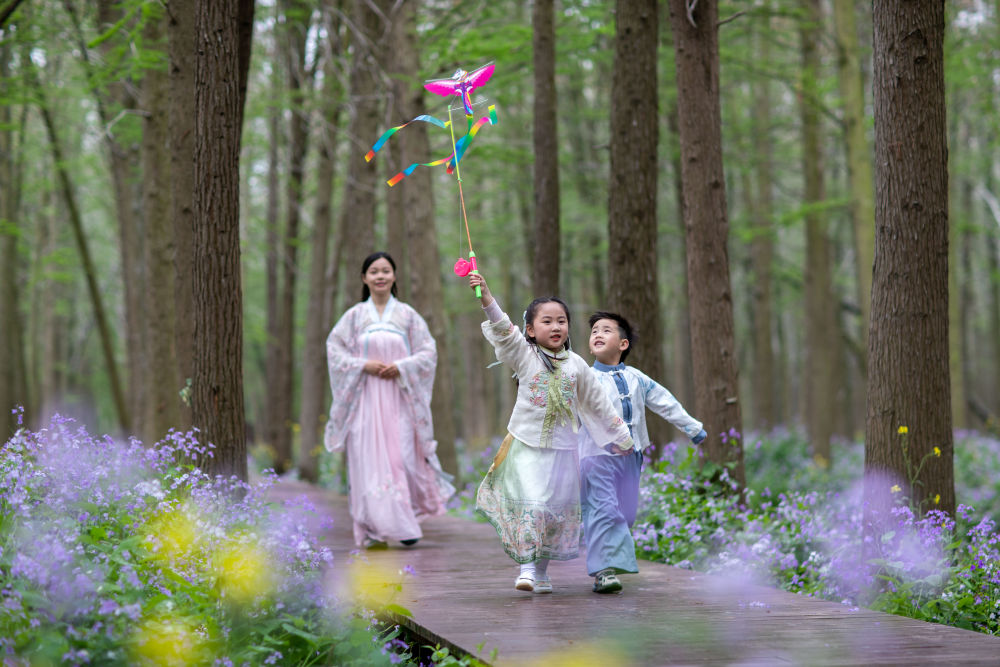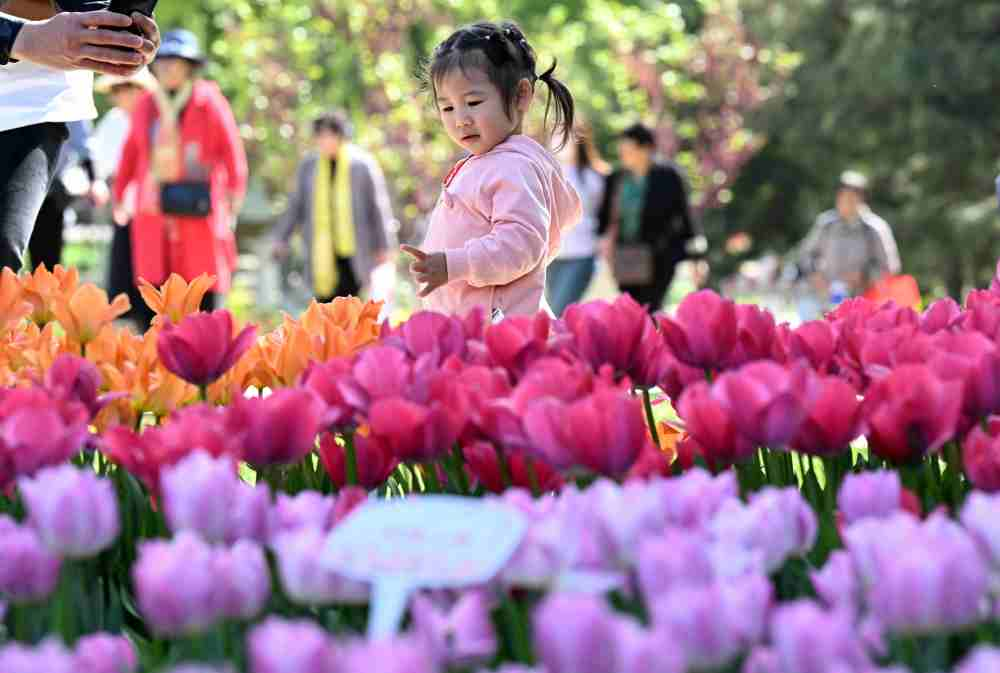 4月16日,小朋友在河北石家庄植物园游玩。新华社发(陈其保摄)