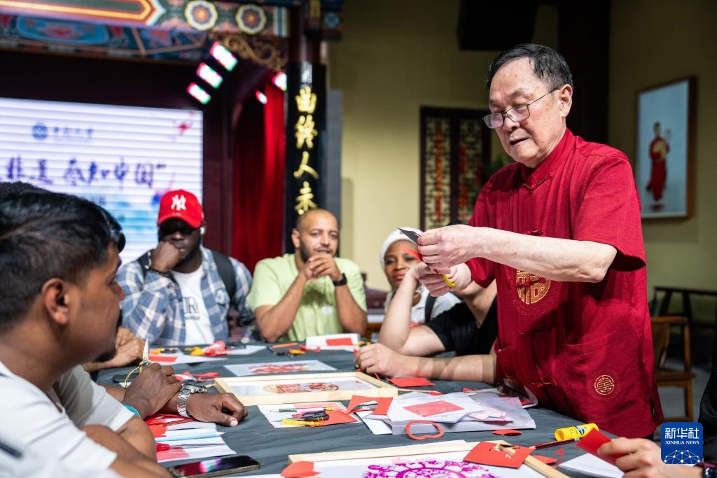 4月18日,在长沙非物质文化遗产馆,非遗传承人(右一)为留学生介绍剪纸技艺。