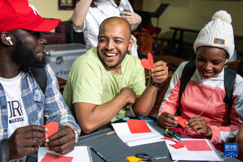 4月18日,在长沙非物质文化遗产馆,留学生体验剪纸。