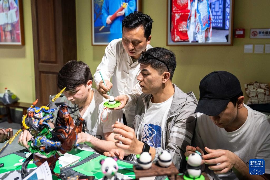 4月18日,在长沙非物质文化遗产馆,非遗传承人(左二)向留学生介绍面塑技艺。