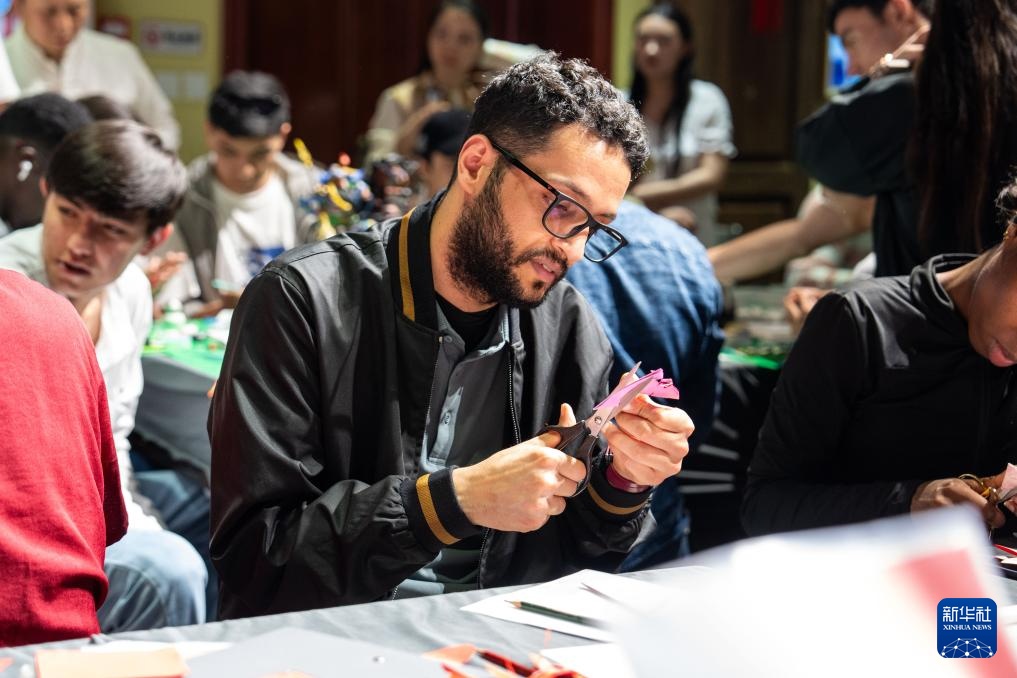 4月18日,在长沙非物质文化遗产馆,留学生在体验剪纸。