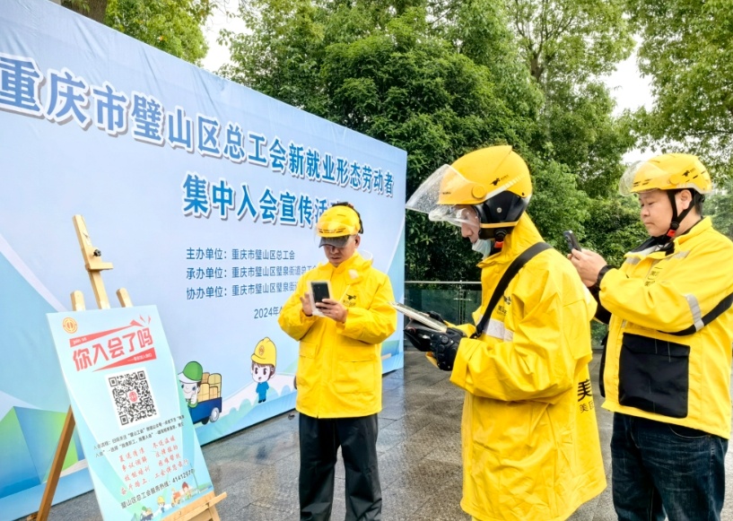 在现场,工作人员为新就业形态劳动者们送上宣传资料,并耐心进行入会及互助保障的政策宣传。骑手们通过扫码关注“璧山工会”公众号,填写个人信息,提交入会申请,1分钟就拥有了“工会会员”新身份。