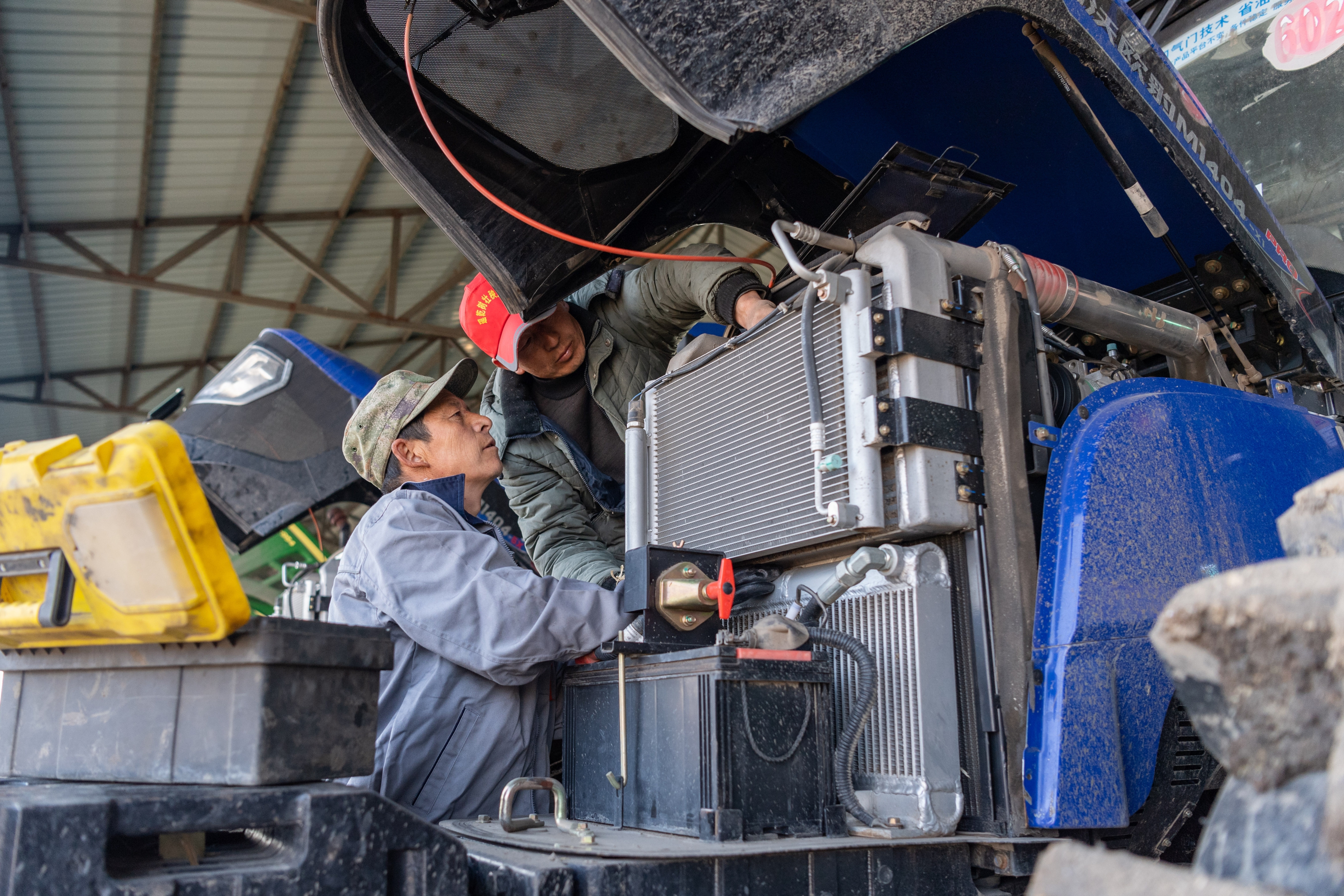 2024年4月3日,在黑龙江省勃利县一家水稻种植专业合作社,工作人员在检修农机。新华社记者 谢剑飞 摄