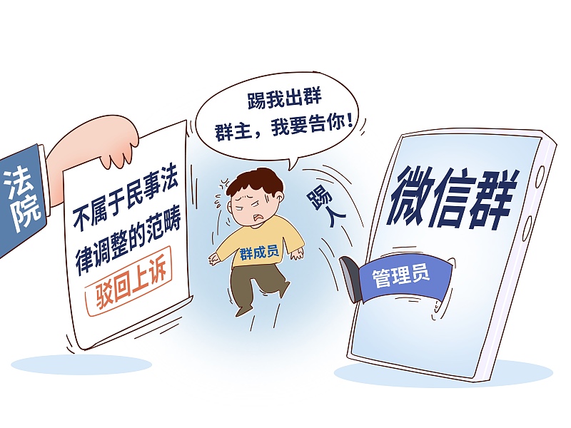 微信群群主、管理员作为群组管理者,拥有平台赋予的“踢人”权。然而,当被踢成员感到“伤自尊”时,能要赔偿吗?被踢出后还想入群怎么办?不久前,有人为此与“踢人”的群管理员对簿公堂。北京市第四中级人民法院对这样一起涉群聊被踢案件二审后认为,该类行为产生的纠纷不属于民事法律调整的范畴,据此判决驳回了上诉。