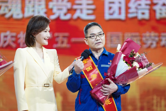 节目设置致敬劳模的环节,邀请10名劳模工匠先进代表登上舞台,聆听他们掷地有声的奋斗宣言,并献上鲜花。