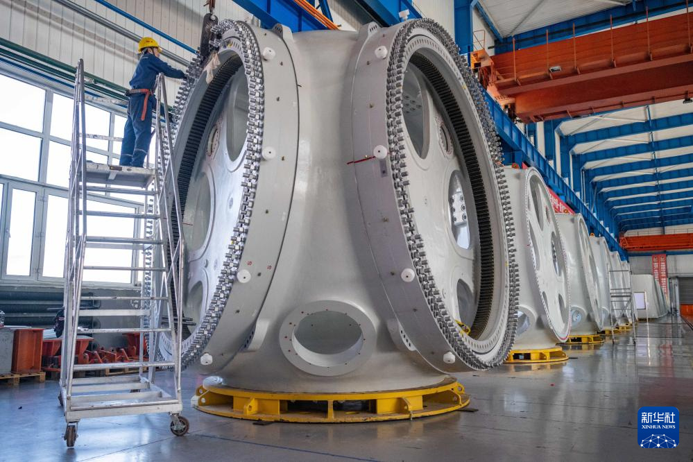 4月28日,在位于黑龙江省齐齐哈尔市的中国一重集团有限公司,工作人员在风电设备装配车间内加工风电轮毂。新华社记者 谢剑飞 摄