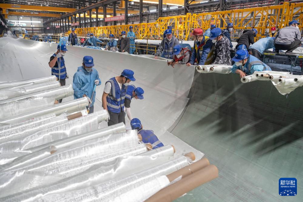 4月28日,在一重龙申(齐齐哈尔)复合材料有限公司,工作人员在厂区进行风电叶片生产作业。新华社记者 谢剑飞 摄