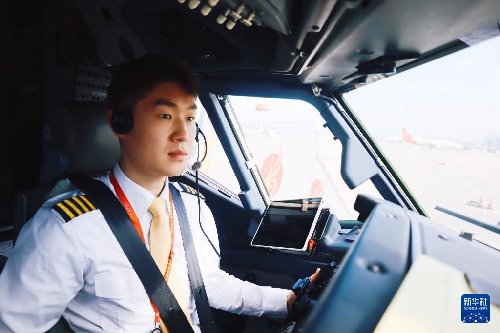 长安航空9H8409飞行机组机长杨紫龙在工作中(资料照片)。新华社发