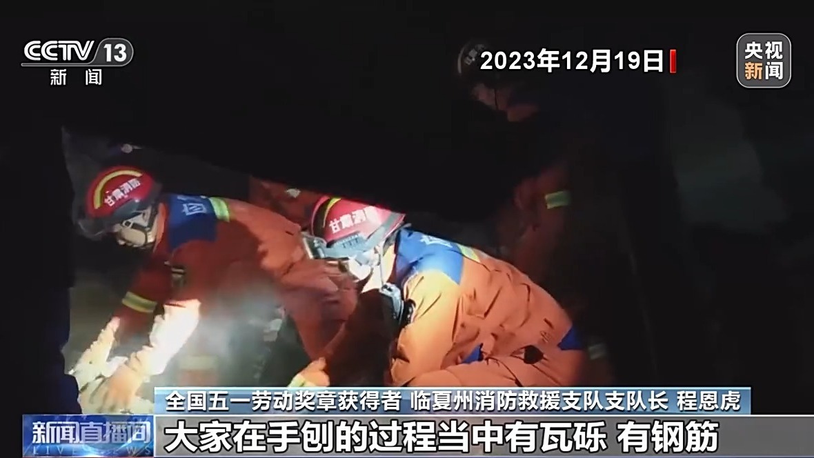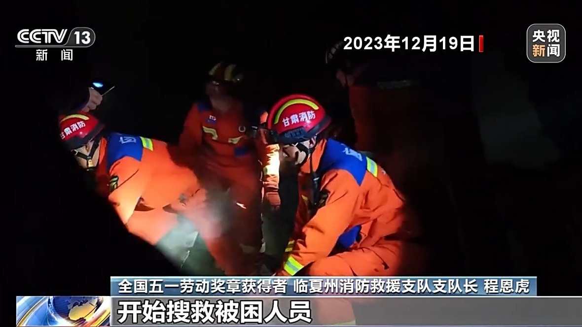 全国五一劳动奖章获得者 临夏州消防救援支队支队长 程恩虎:我们到达大河家镇的时候,全镇已经全部停电。从咱们废墟里面逃离出来的这些老百姓都穿着很单薄的衣服,有些披的毛毯,有些披的被子,在路边的空地里点的柴火进行取暖。当看到咱们消防指战员的身影后,他们立马感觉靠山来了,第一时间咱们和百姓在一起形成了一支强力的战斗联盟,开始搜救被困人员。