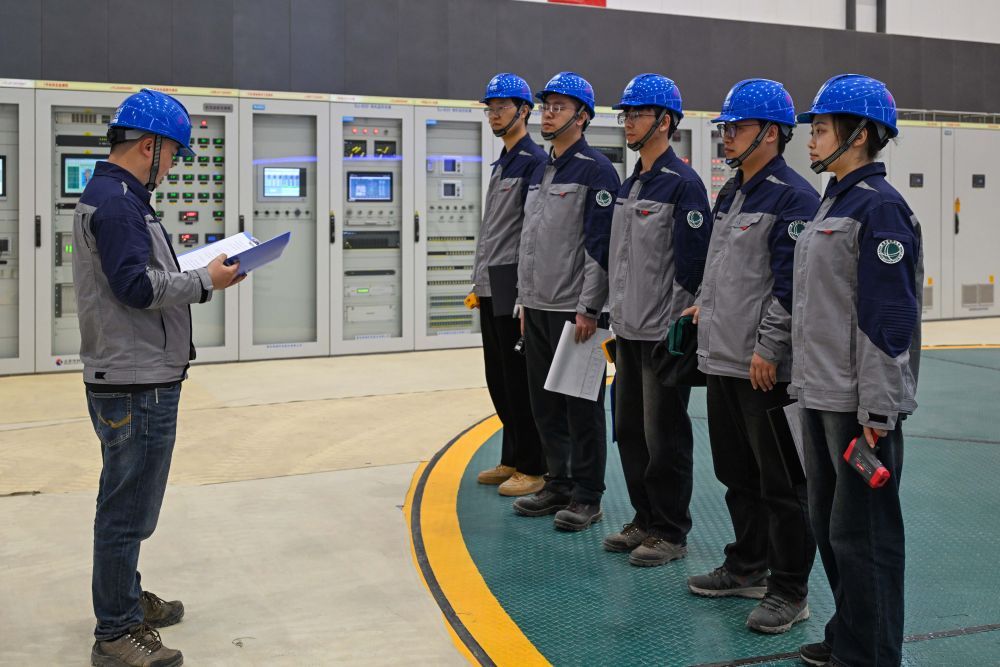 4月23日,在国网新源新疆阜康抽水蓄能电站地下厂房,工作结束后工作人员在现场进行检修交代。新华社记者 陈朔 摄