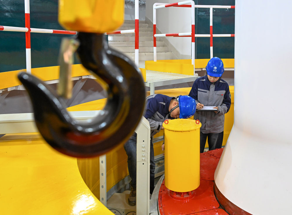 4月23日晚,工作人员在国网新源新疆阜康抽水蓄能电站地下厂房对3号机组进行调试。新华社记者 陈朔 摄
