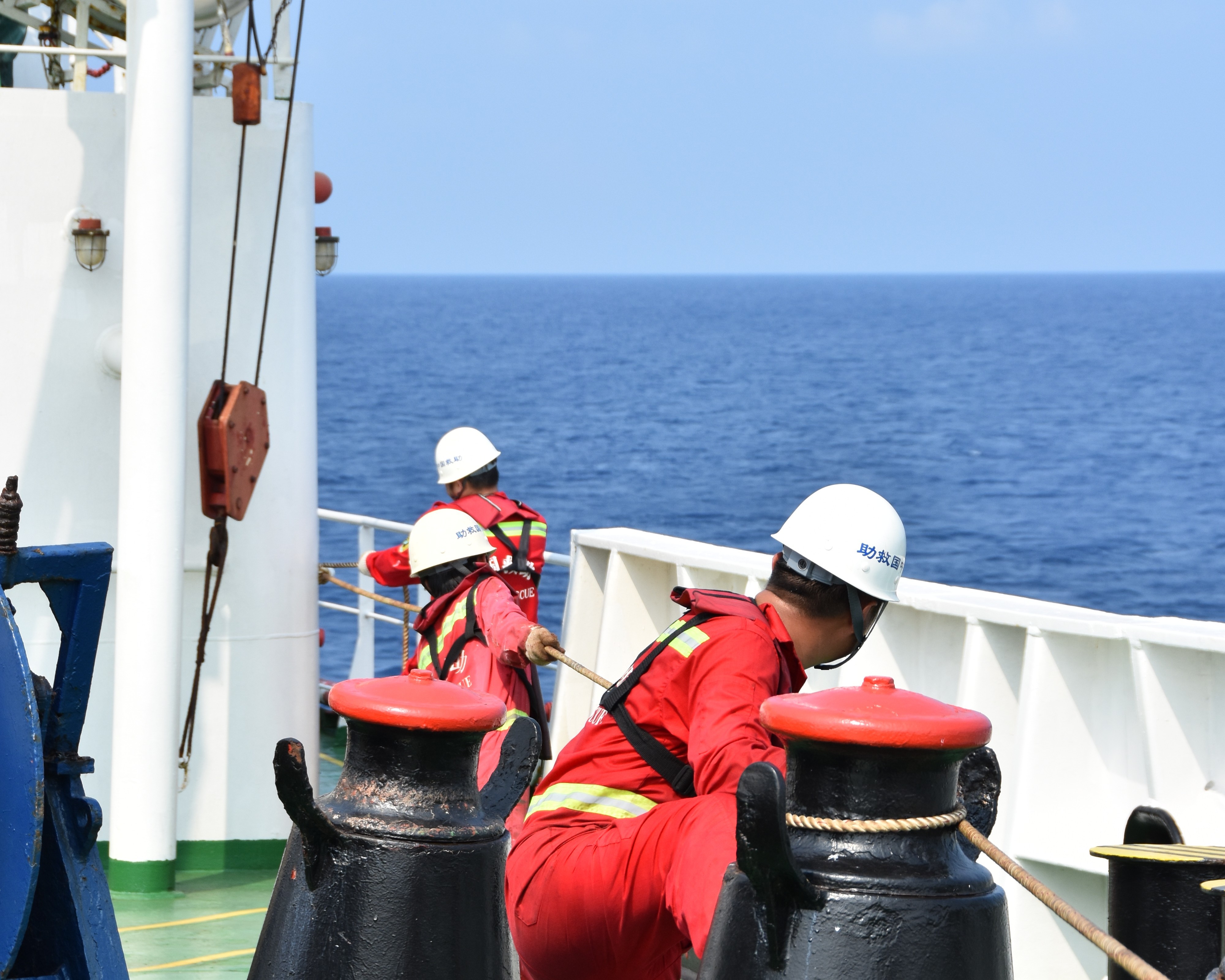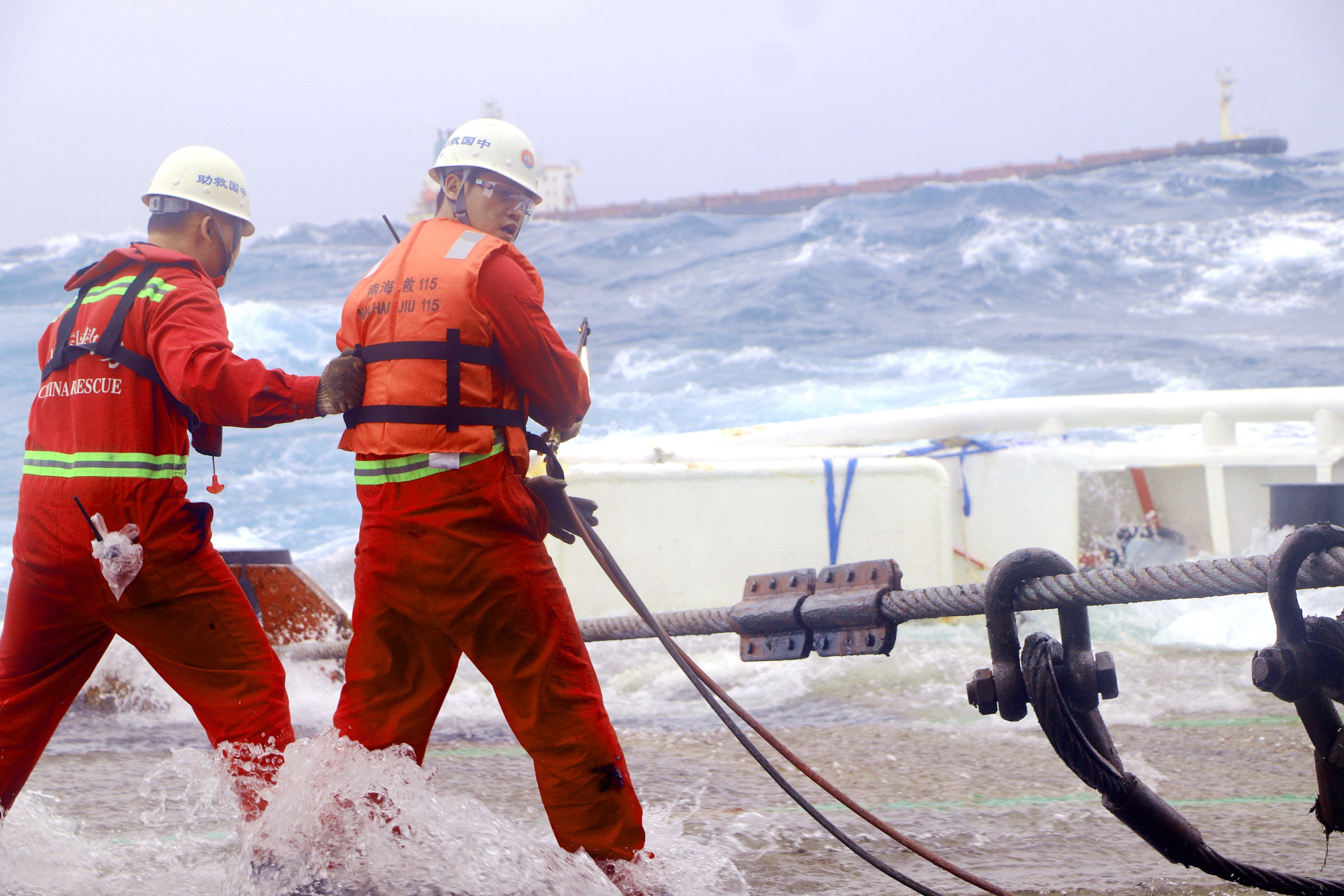 4月10日,“南海救115”轮甲板部人员正在安装甲板安全绳,以保障极端天气下甲板作业人员安全。新华社记者 夏天 摄