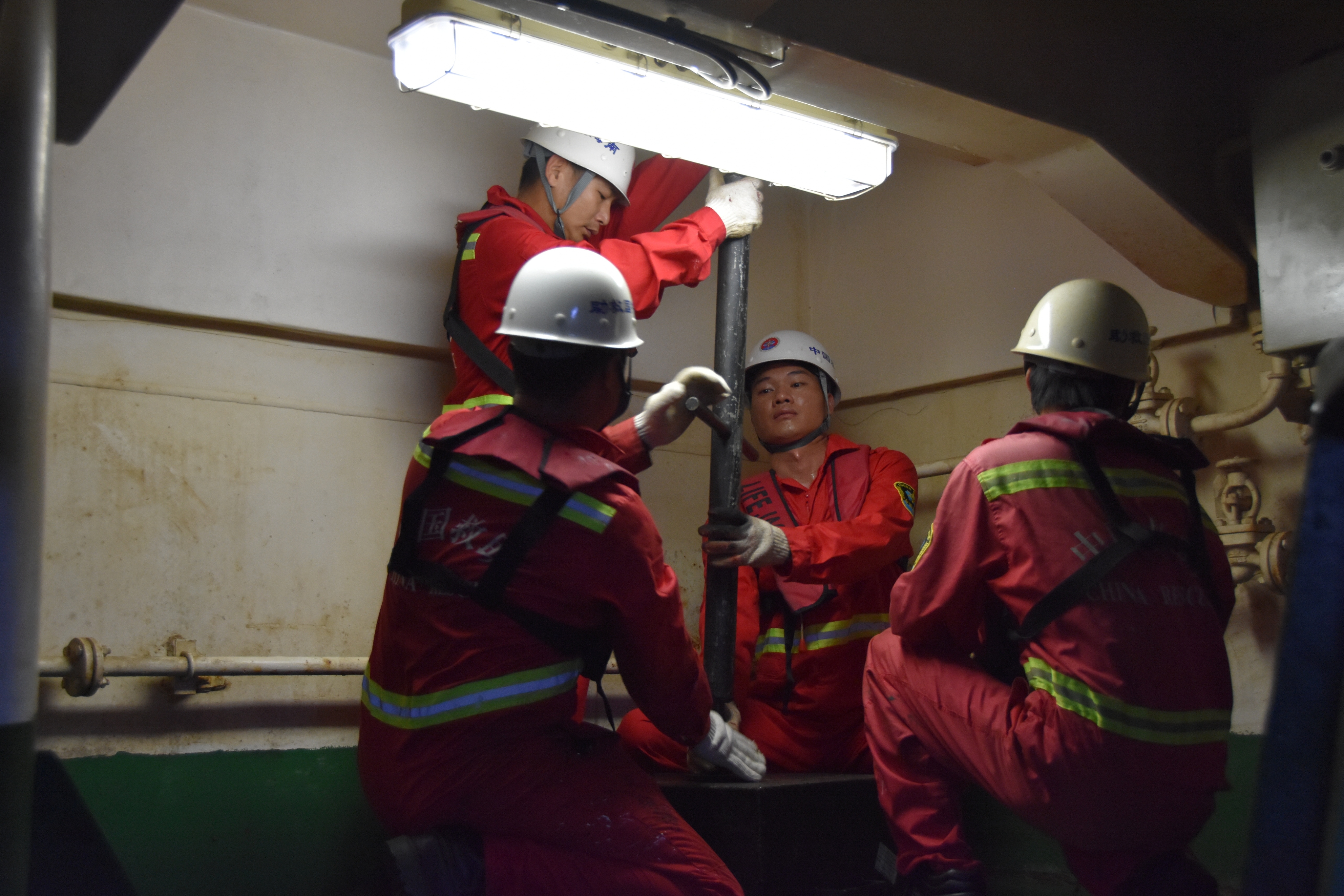 4月10日,“南海救115”轮船员正在舵机房进行堵漏应急演练。新华社记者 夏天 摄