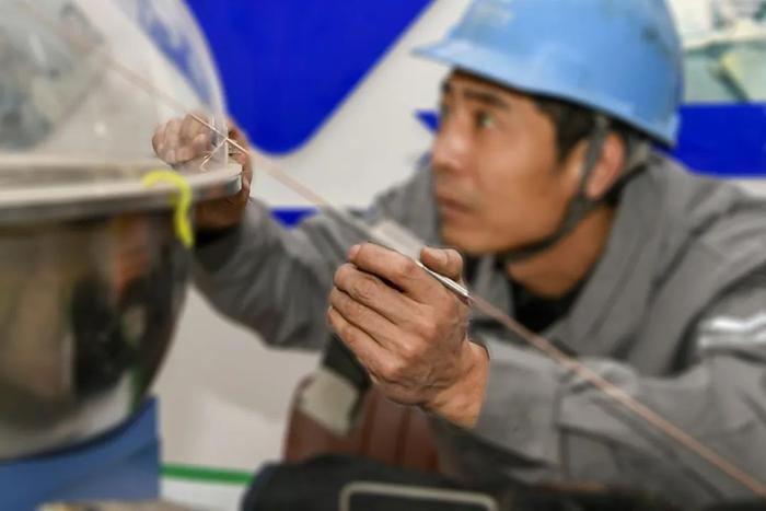 ▲如果只看这双朴实的手,很难联想到精密至极的小型航空发动机制造。但正是靠着这双手,来自中国融通集团科研院航发公司的总装技师郁启宁精准装配多型主力单品,实现多项技艺创新,为国产无人装备提供强劲可靠的“中国引擎”。