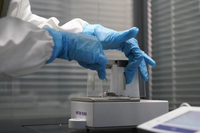 ▲狭长的镊子、精密的仪器是中国中检安徽公司检验员刘志虎手中的研究利器。这双稳重而不失灵巧的手在实验台上得出了一系列精确的数据,让客户准确了解样品成分、纯度、性能等重要信息。