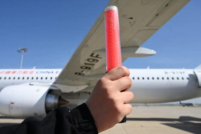 ▲不论白天或黑夜、飞机出港或是进港,总是会有来自中国东航的一只只手举起红色闪光的接引指挥棒,引导国产大飞机C919安全有序地运行,光亮虽小,亦能指引前行。