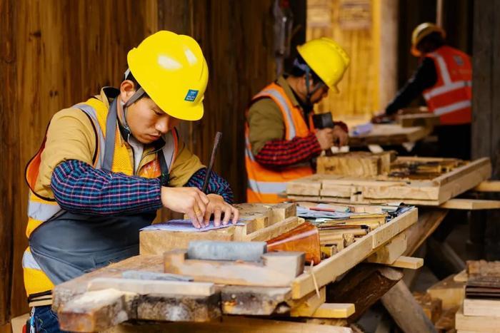 ▲中国建筑旗下中建七局建瓯市历史文化名城保护提升项目细木工的手布满老茧,这双手精心雕琢了上百个木构件,用一凿一木搭建起整栋建筑,在一点一滴中复建出朱文公祠的历史变迁与恢弘壮阔,奏响一曲“千年建州·理学名城”的铿锵赞歌。