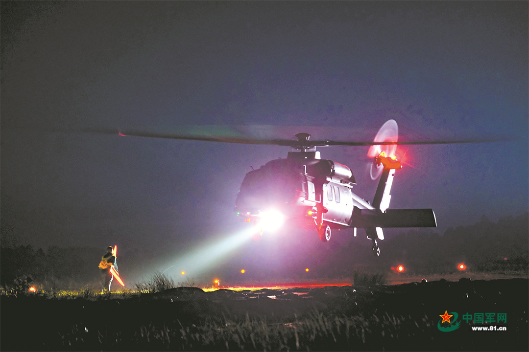 空中通道开辟后,突击编队展开空中投送训练。在武装直升机掩护下,编队根据地形特点,采取空中悬停和着陆机降相结合的方式,对目标地域进行物资投送。