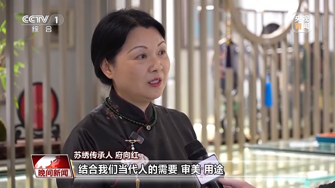 苏绣传承人 府向红:结合我们当代人的需要、审美、用途再来创作设计,希望通过这样的一个传承方式,让我们的非遗、让我们的苏绣能传播地更远,让更多的人来喜欢它、使用它。