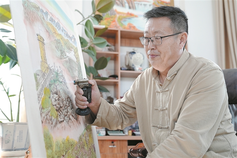 5月7日,杨新平在创作烙画作品。秦天 摄