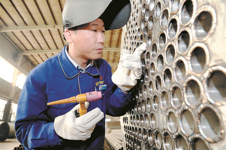 4月20日,邵旭鹏在焊接设备蒸发器换热管。朱彦维 摄