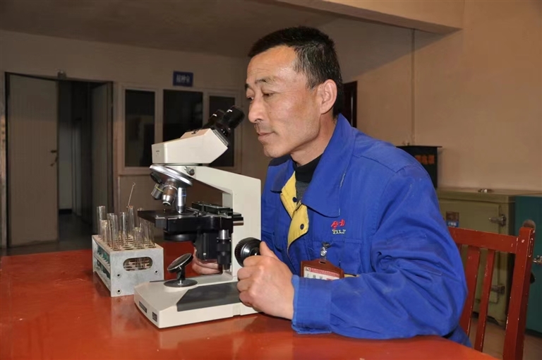 罗建忠通过显微镜观察菌种生长情况(资料图片)。张佳怡 提供