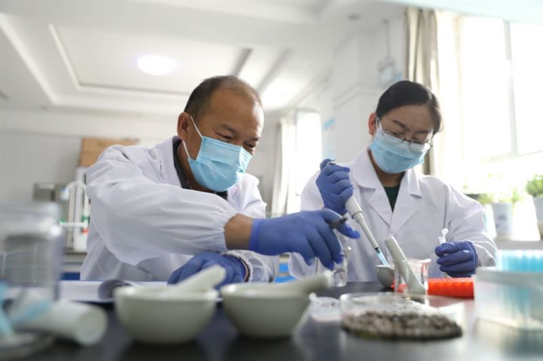 4月28日,练文明(左)在实验室里和同事进行棉花抗虫基因检测实验。王芳芳 摄