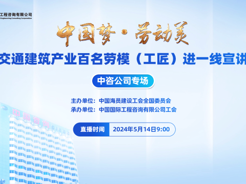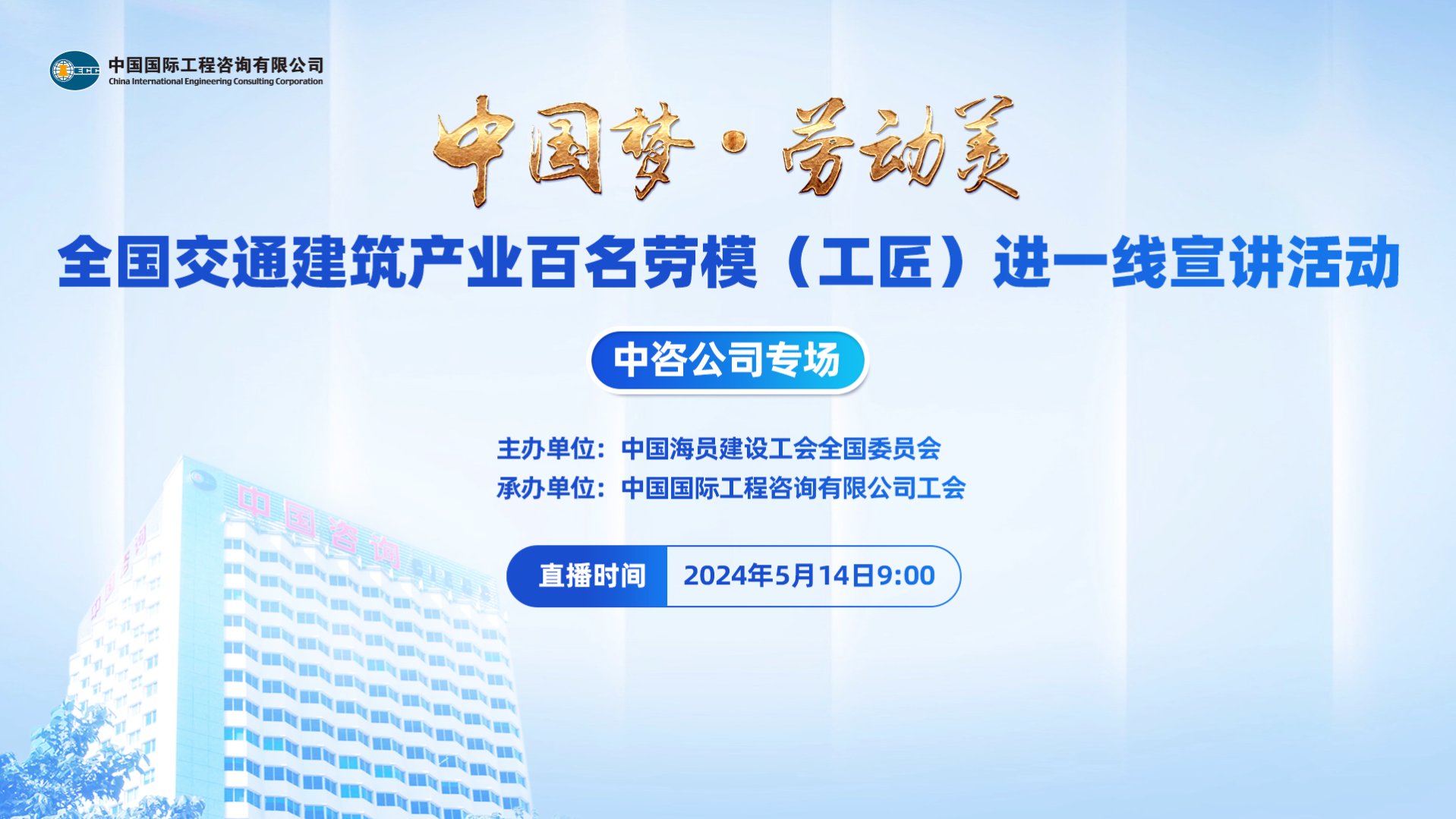 直播回顾丨中国梦·劳动美全国交通建设产业百名劳模(工匠)进一线宣讲活动-中咨公司专场 为弘扬劳模精神、劳动精神、工匠精神,巩固团结奋斗的思想基础,激发广大职工为建设国家高端智库和世界一流咨询机构贡献智慧和力量,为国资央企发展新质生产力注入源泉动力。5月14日上午9点,由中国海员建设工会全国委员会主办,中国国际工程咨询有限公司工会承办的“中国梦·劳动美全国交通建设产业百名劳模(工匠)进一线宣讲活动-中咨公司专场邀请全国劳模(工匠)代表以职工喜闻乐见、寓教于乐的形式,讲述其爱岗敬业、勤奋工作,锐意进取、勇于创新的感人事迹。中工网首页、微博、抖音、视频号同步直播。