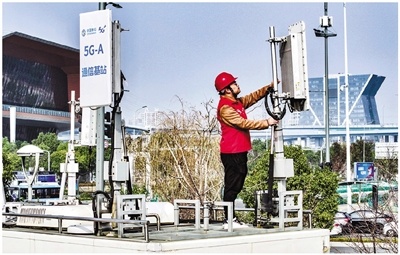浙江移动技术人员正在调测5G-A基站。5G-A是5G向6G发展的关键阶段,相较于5G,其具有更高速率、更大连接、更低时延等特点。