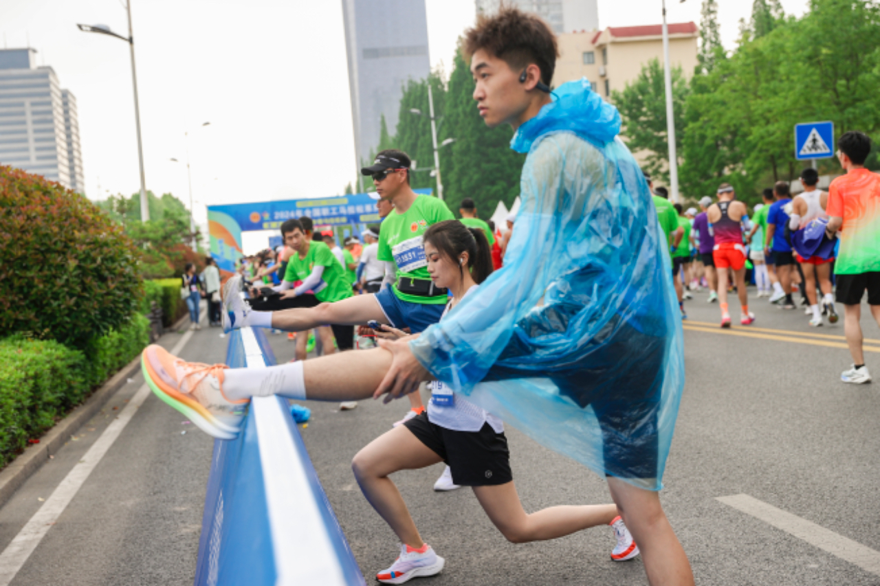 5月19日,山东日照,参赛者在2024年全国职工马拉松系列赛事(日照半程马拉松站)起点进行热身。2024年全国职工马拉松系列赛事(日照半程马拉松站)设置半程马拉松(21.0975公里)、特色方阵领先跑(6.6公里)、健康跑(2.5公里)三个比赛项目。