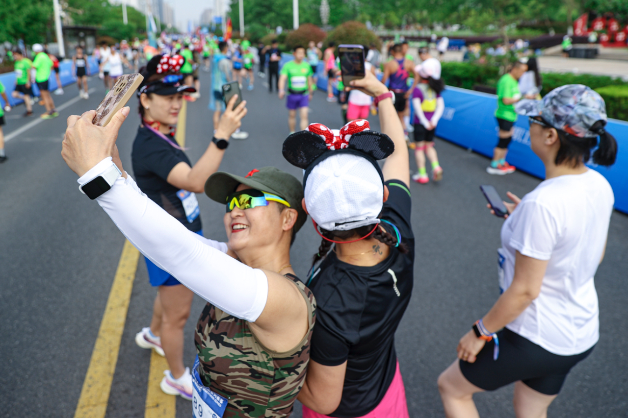 5月19日,山东日照,赛后参赛者们在特色打卡背景墙前合影留念。