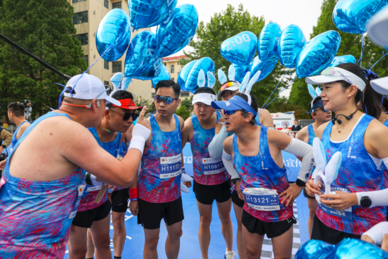 5月19日,山东日照,配速员进行赛前动员。