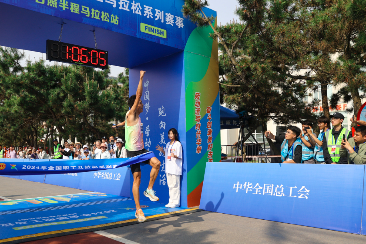5月19日,山东日照,王佩林以1小时06分06秒的成绩夺得半程马拉松男子组冠军。